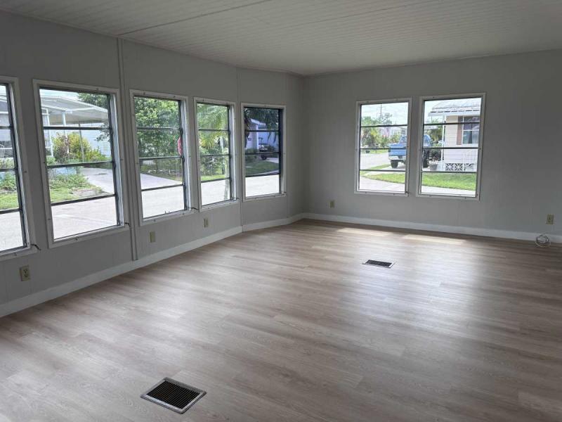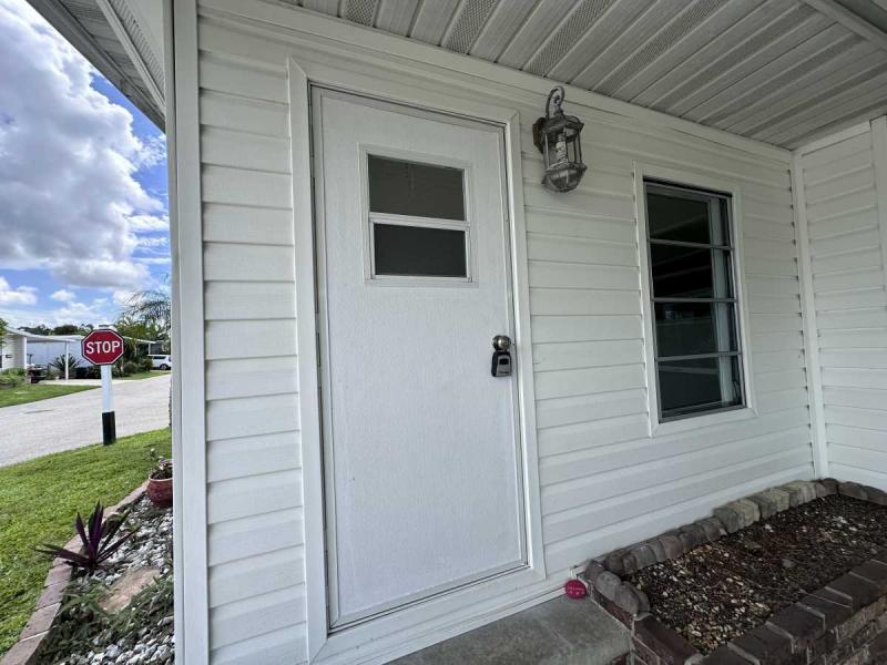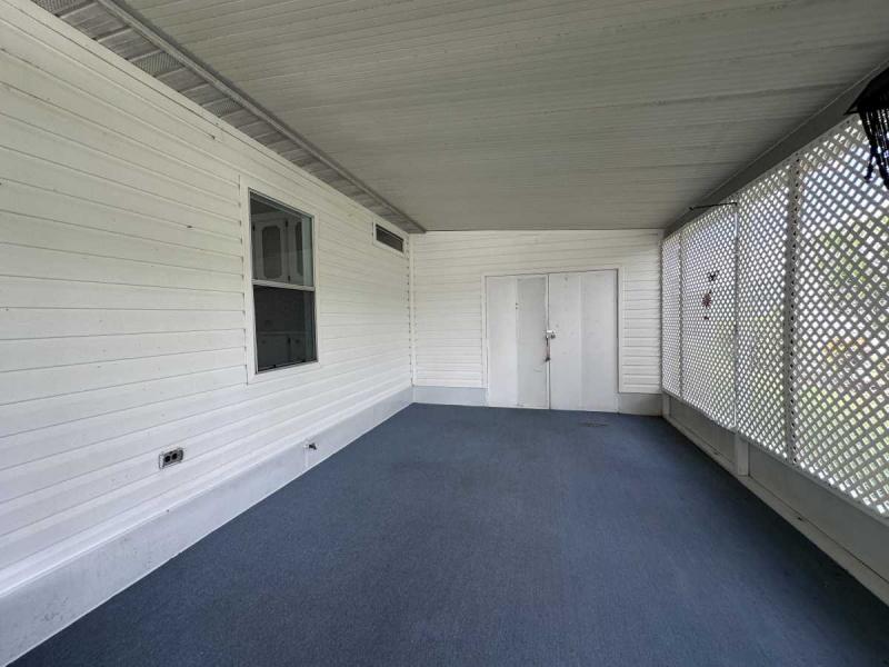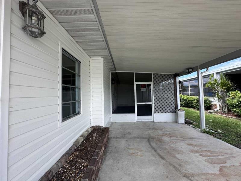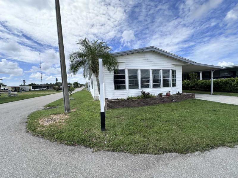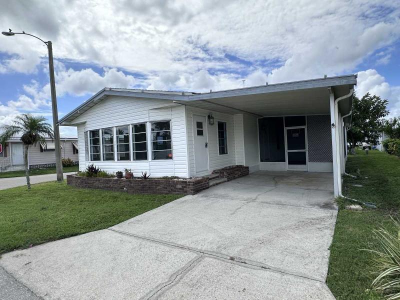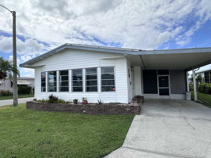 This home is bright and cheerful and on a corner lot near the pools and clubhouses. The roof was replaced in 2023 and new flooring is luxury vinyl plank flooring including new baseboards. The interior has all been replanted and the second bathroom has been updated. All the kitchen cabinets were refinished and epoxy countertops in the bathroom and kitchen. The new appliances in the kitchen are are stainless steel and has a breakfast bar island separating the kitchen from the living area. Cathedral ceilings gives it a very open and inviting feel and full of natural light. AC has been serviced with no issue. The huge front porch is enclosed and give you so much more living space. It has a newer washer/dryer in the humungous shed with double doors and plenty of storage space. The large screened in Lanai is a great open area and the screens are covered with lattice for your privacy. Come and see this great home at a great prices!!!